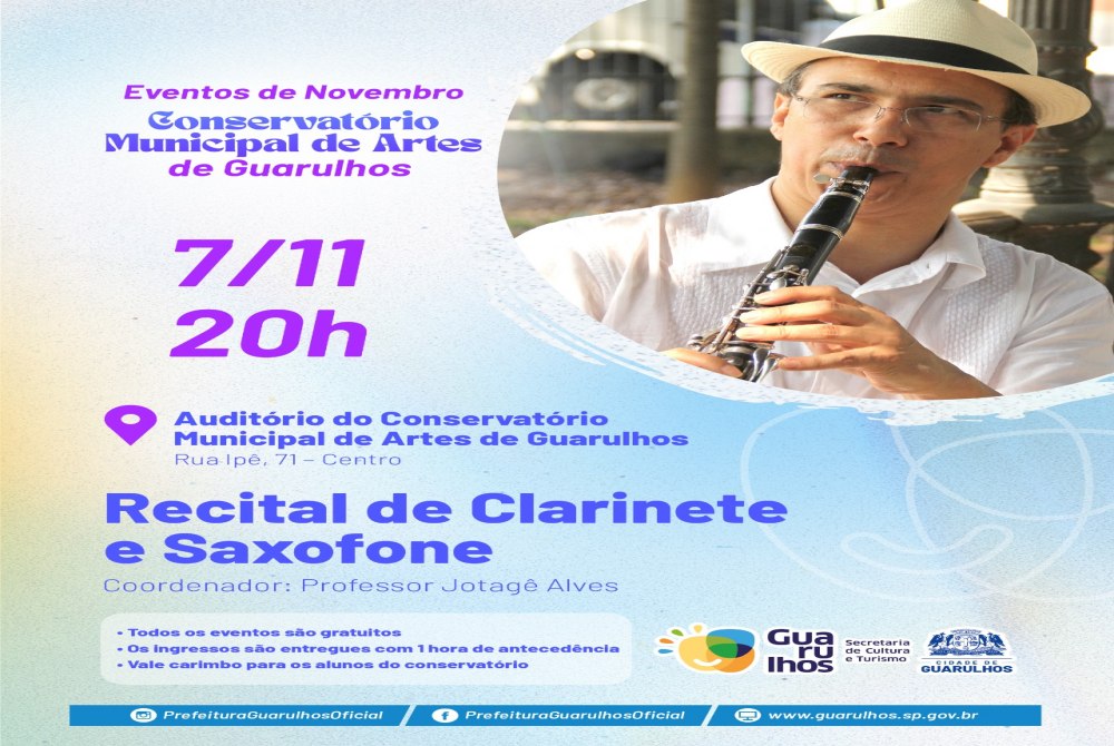 Nesta sexta-feira (7), a partir das 20h, o auditório do Conservatório Municipal de Artes de Guarulhos receberá o Recital de Clarinete e Saxofone, espetáculo protagonizado pelos alunos da instituição. O evento é gratuito e os ingressos são distribuídos com 1 hora de antecedência do início do espetáculo.