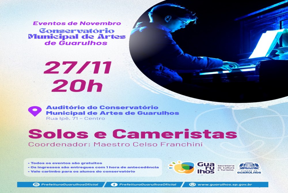 O Auditório do Conservatório Municipal de Artes de Guarulhos receberá, na próxima quinta-feira de novembro, dia 27, às 20h, o espetáculo Solos e Cameristas. Gratuita, a apresentação reúne músicos da instituição que subirão ao palco com instrumentos, como piano, violino, flauta, contrabaixo e outros.