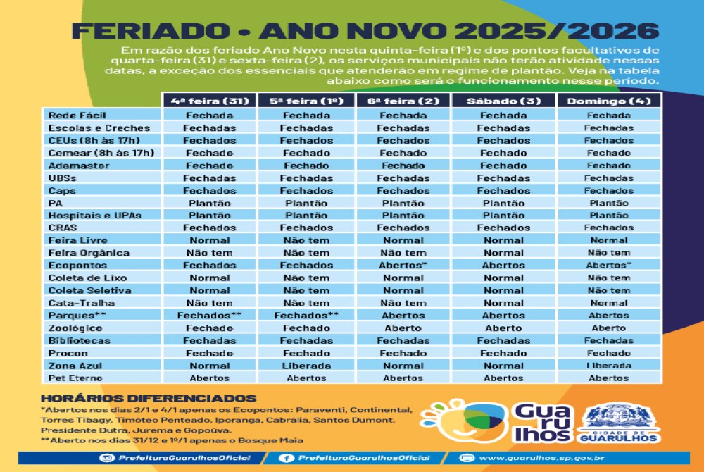 Em razão do feriado de Ano Novo nesta quinta-feira (1º) e dos pontos facultativos de quarta-feira (31) e sexta-feira (2), os serviços municipais não terão atividade nessas datas, a exceção dos serviços essenciais que atenderão em regime de plantão. Veja na tabela abaixo como será o funcionamento nesse período.