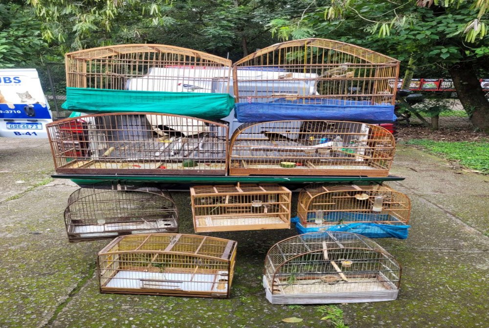 As aves foram encontradas em gaiolas penduradas no muro de uma residência na rua Débora Oliveira de Almeida. Durante a fiscalização, os agentes constataram a ausência de anilhas que comprovassem a origem legal dos animais.